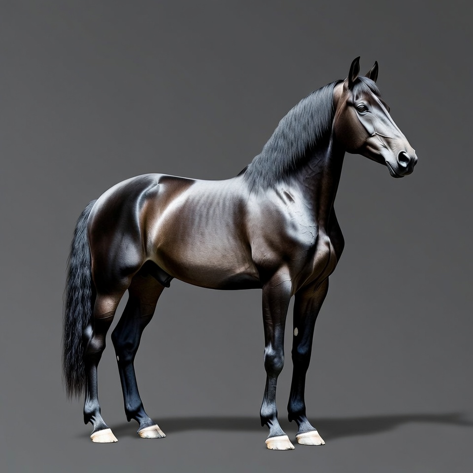A majestic black horse stands in a side profile on a plain gray background. Its glossy coat shines with metallic highlights, and its long mane and tail flow elegantly. The horse has a strong build with defined muscles and white markings on its hooves.