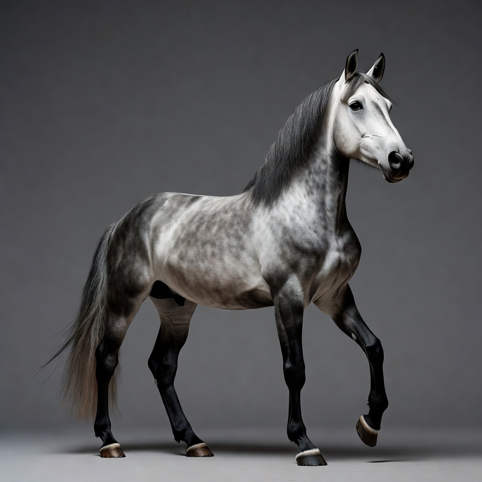 A majestic grey horse with a flowing mane and tail stands on a dark gray background. It has dark legs with white markings on the hooves and a subtle dappled coat. The horse faces slightly to the side with one front leg raised.