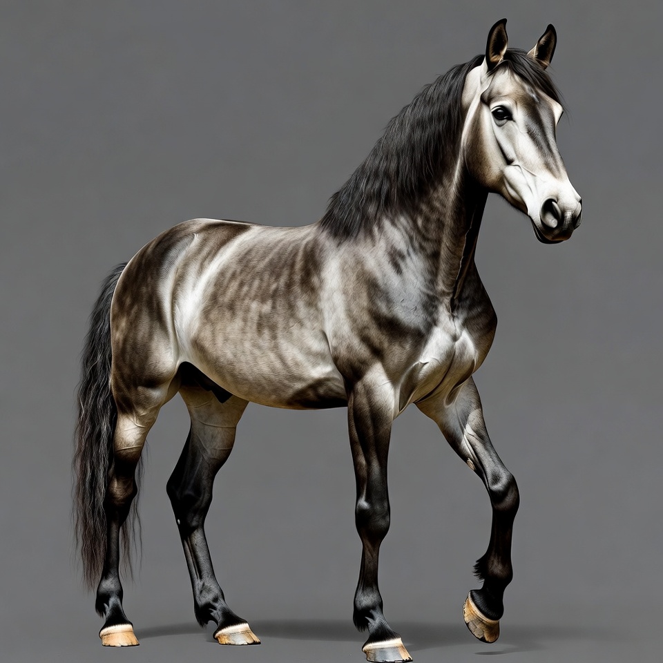 animal, black mane, black tail, dappled horse, dark legs, equine, gray background, isolated background, light hooves, metallic coat, shiny horse, silver dapple, stallion, standing horse, horse
