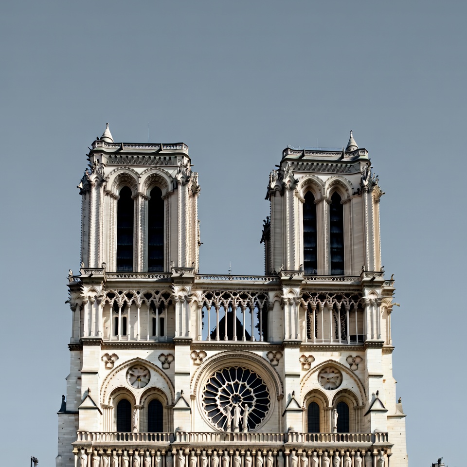 The iconic facade of Notre Dame Cathedral in Paris features two tall Gothic towers with pointed arches and intricate stone carvings. A large rose window sits prominently in the center above arched doorways. The building is photographed against a clear gray sky.