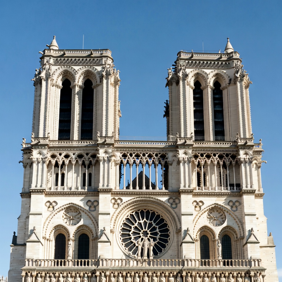 The iconic facade of Notre Dame Cathedral in Paris features two tall towers with pointed spires. A large rose window sits at the center above ornate Gothic arches and sculptures. The stone structure stands against a clear blue sky.