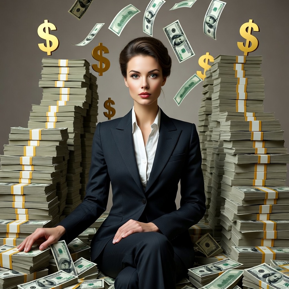 A brunette woman in a navy business suit sits confidently on tall stacks of gold-colored dollar bills. Dollar bills rain down around her from above. She holds bills in her hands against an isolated background.
