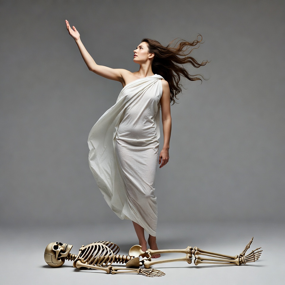 Woman in white toga over skeleton