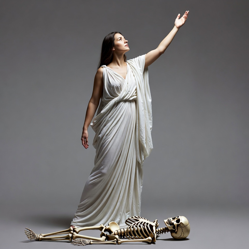 A woman with long dark hair wears a flowing white draped gown and extends her arms upward in a dramatic pose. She stands on a plain gray background next to a human skeleton lying on the ground. Her expression is intense as she reaches toward the sky.