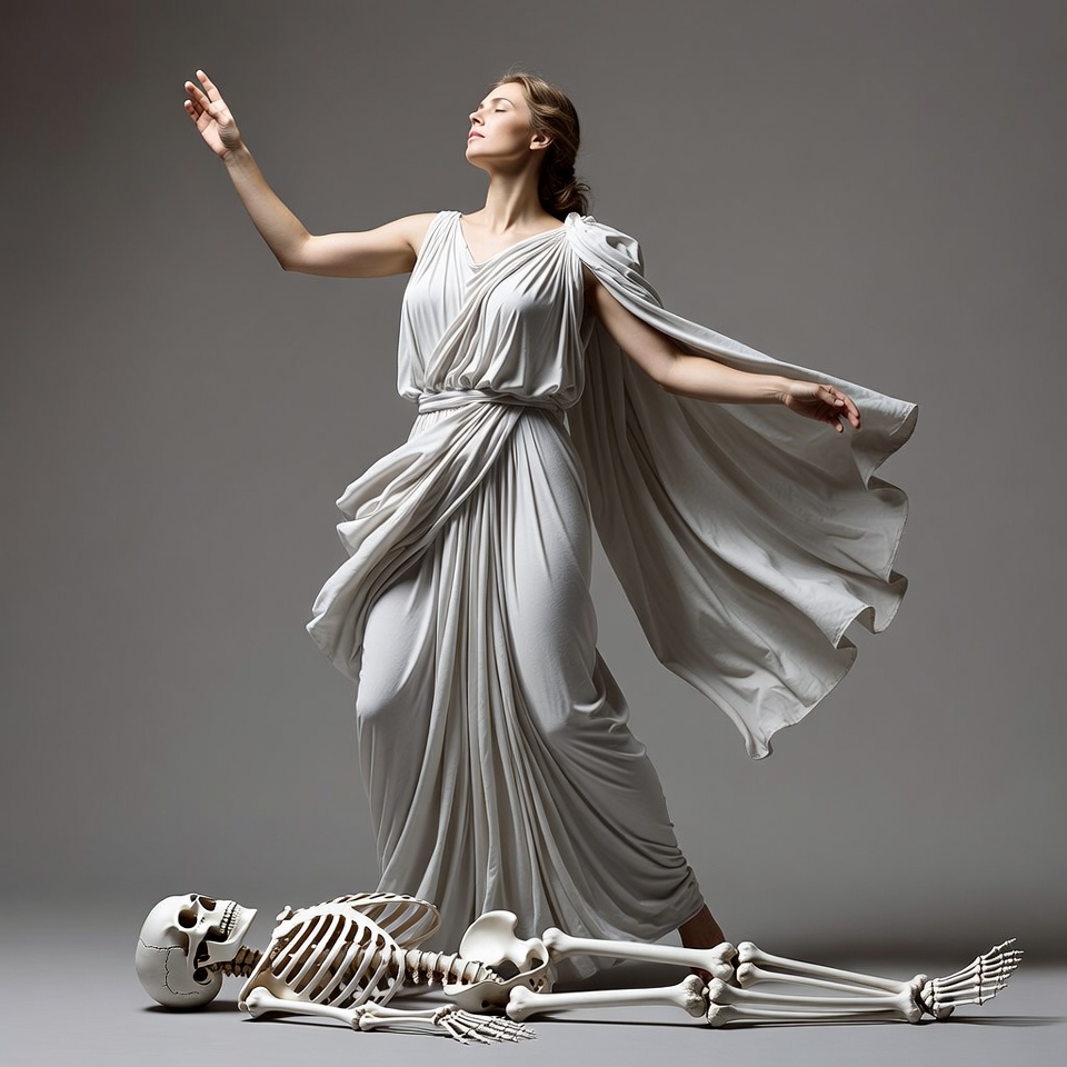 A woman in a flowing white Grecian gown stands with arms raised over a white human skeleton lying on the ground. Her draped dress billows dramatically, and she has light brown hair. The scene is set against a plain gray background.