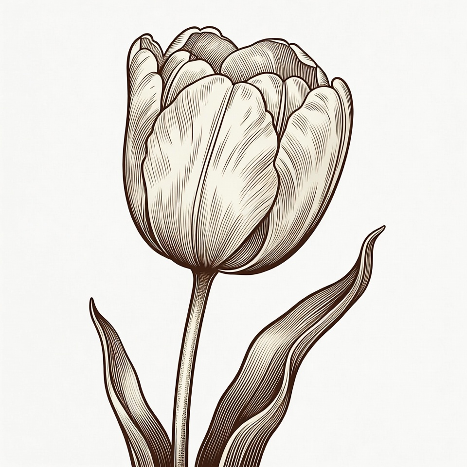 botanical art, engraving, floral, flower, hand drawn, illustration, isolated background, leaves, line art, petals, sketch, stem, tulip flower, vintage drawing, white tulip, tulip
