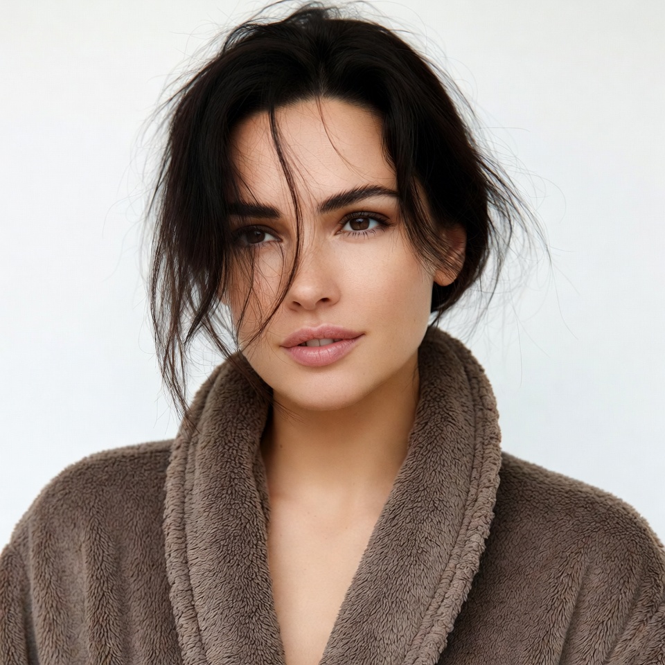 A woman with long wavy dark hair gazes at the camera with a subtle expression. She wears a fluffy brown bathrobe with a high collar. The portrait is set against a plain white background.