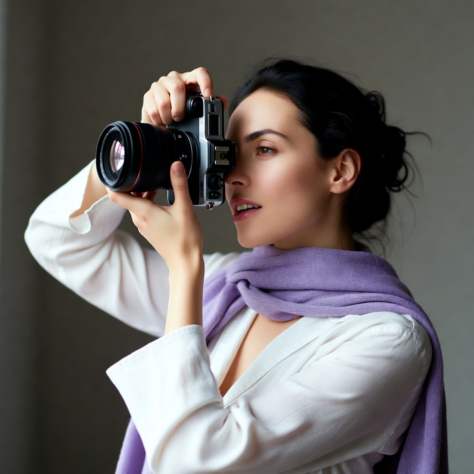 A woman with long dark hair styled in a bun holds a black DSLR camera up to her face. She wears a white blouse and purple scarf, gazing sideways with pursed lips. The image features a plain gray background.