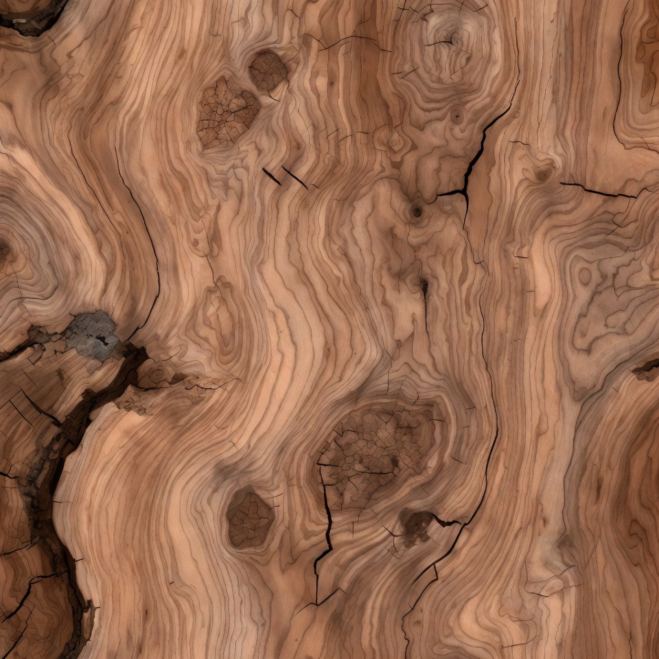 A close-up view of natural wood grain with intricate patterns of knots, cracks, and swirls. The texture features rich brown tones and prominent grain lines. It appears seamless, ideal for backgrounds or tiling.