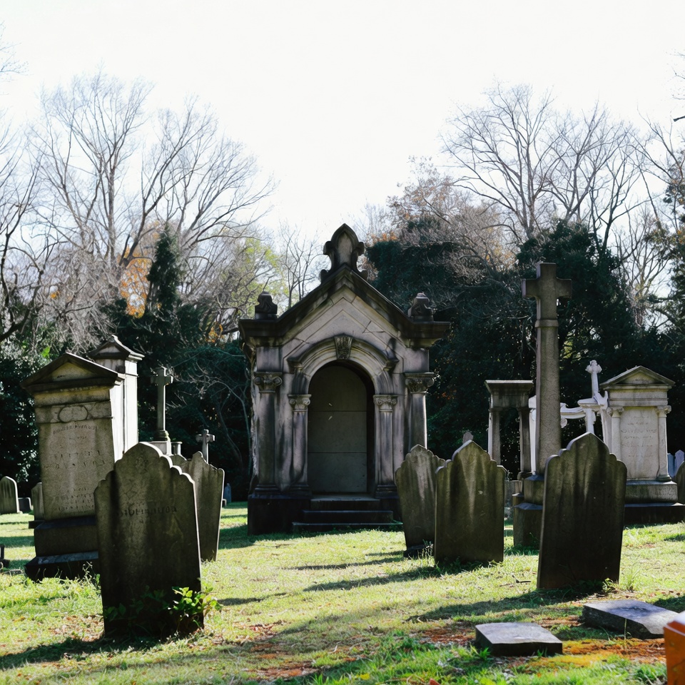 arched doorway, autumn trees, bare trees, burial ground, cemetery grounds, crosses, crypt, gothic architecture, grass, gravestones, graveyard, headstones, historic cemetery, mausoleum, monuments, old cemetery, stone mausoleum, sunny day, tombstones, cemetery