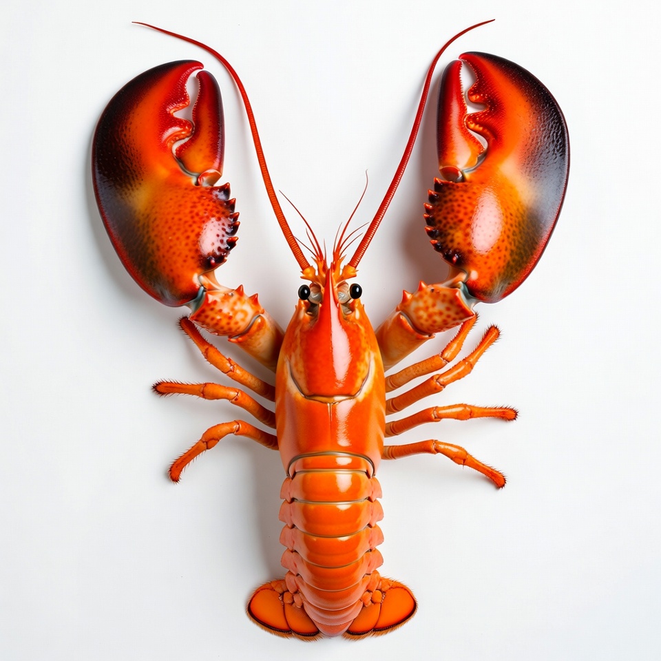 antennae, claws, crustacean, eyes, fresh lobster, glossy shell, isolated, legs, marine animal, orange claws, red lobster, seafood, shell, white background, lobster