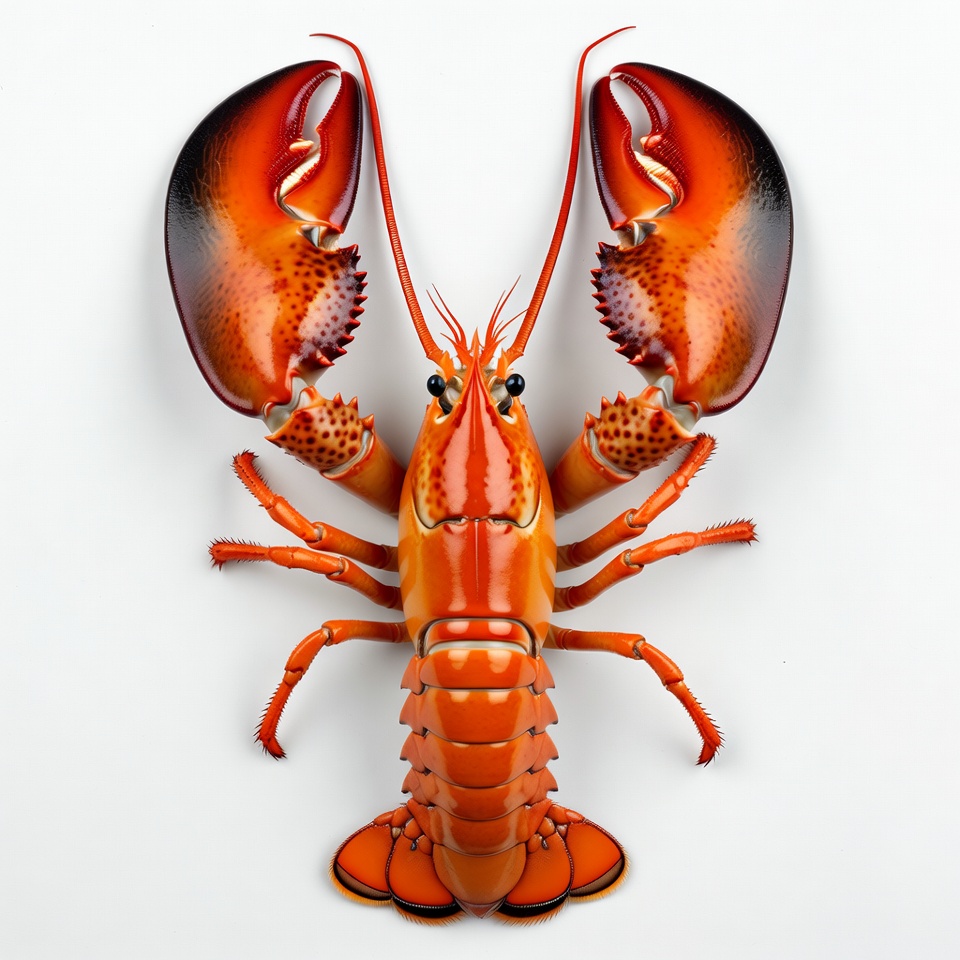 antennae, claws, crustacean, detailed, fresh lobster, glossy, isolated, legs, marine animal, ocean creature, red lobster, seafood, shell, vibrant red, white background, lobster