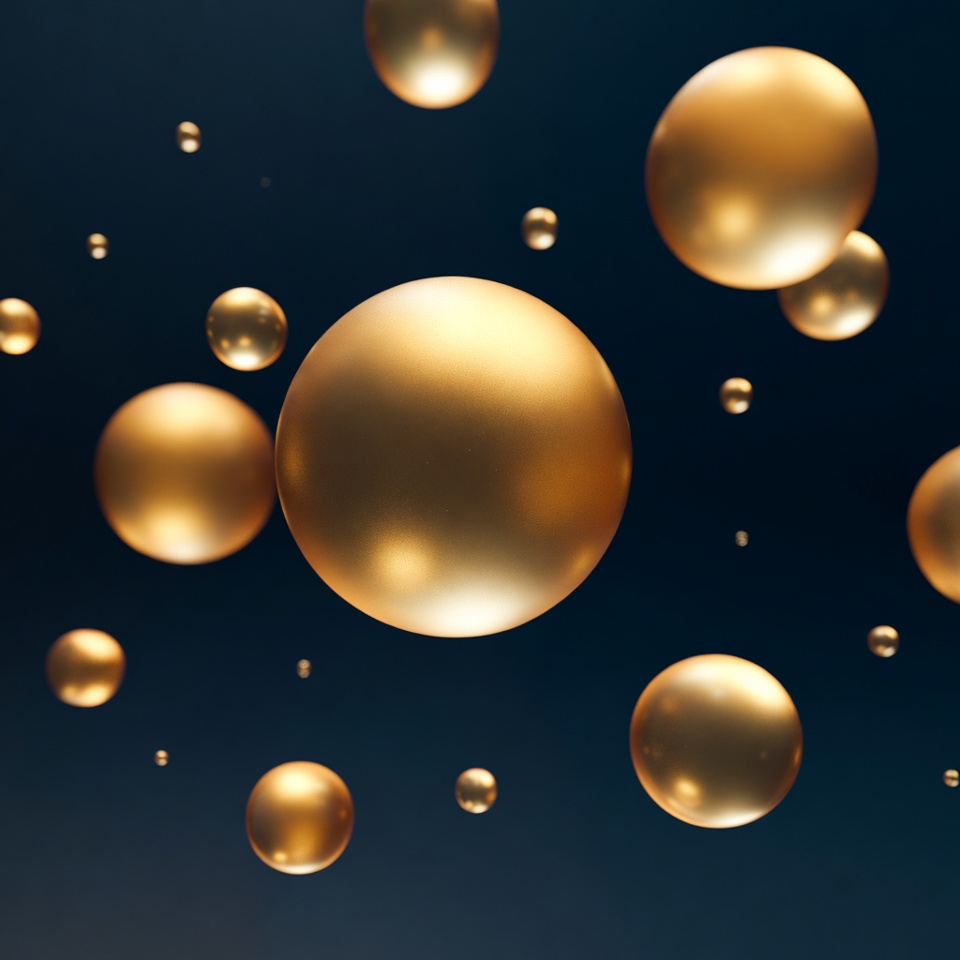 3D render, CGI spheres, abstract art, blue background, bubble art, dark background, dark navy, dynamic float, floating balls, floating gold, floating orbs, glossy spheres, gold balls, gold bubbles, gold dots, gold orbs, golden bubbles, luxury gold, metallic orbs, metallic spheres, orb cluster, reflective surfaces, shiny bubbles, spherical objects, golden spheres