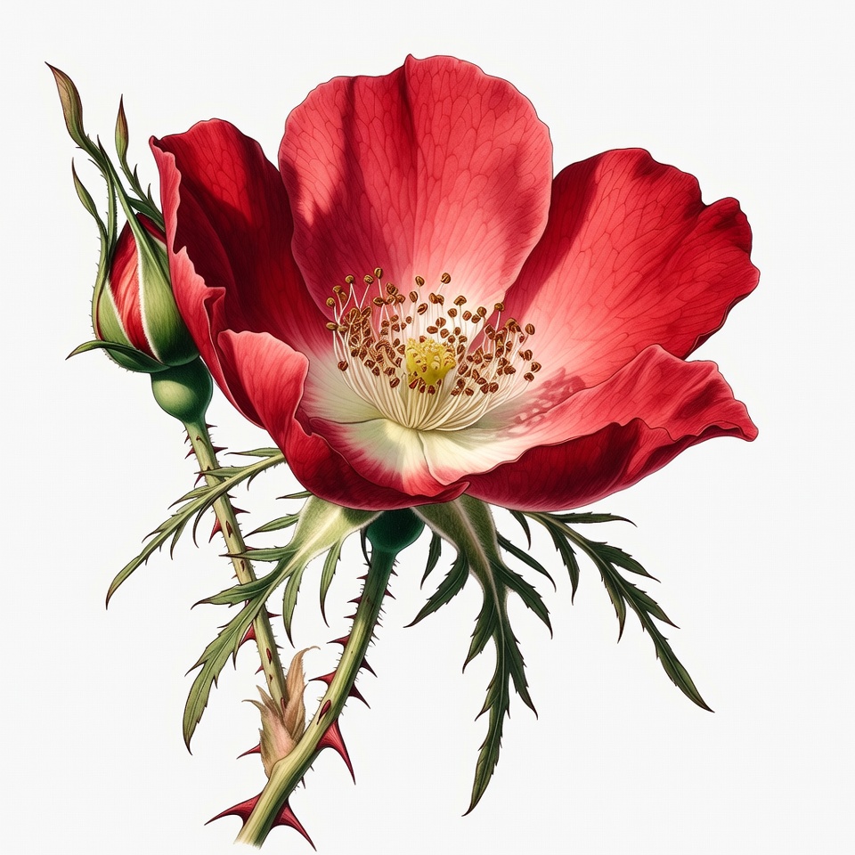 bloom, closeup, floral, flower, garden flower, green leaves, illustration, isolated background, leaves, petals, plant, rose bud, rose flower, stamens, stem, thorns, thorny stem, vibrant red, yellow center, red rose
