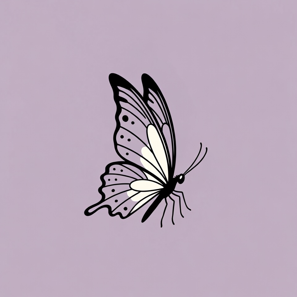 A black outline butterfly with white and purple wings is illustrated on a solid purple background. The butterfly faces right with detailed wing patterns and thin antennae. It appears as simple line art clipart.