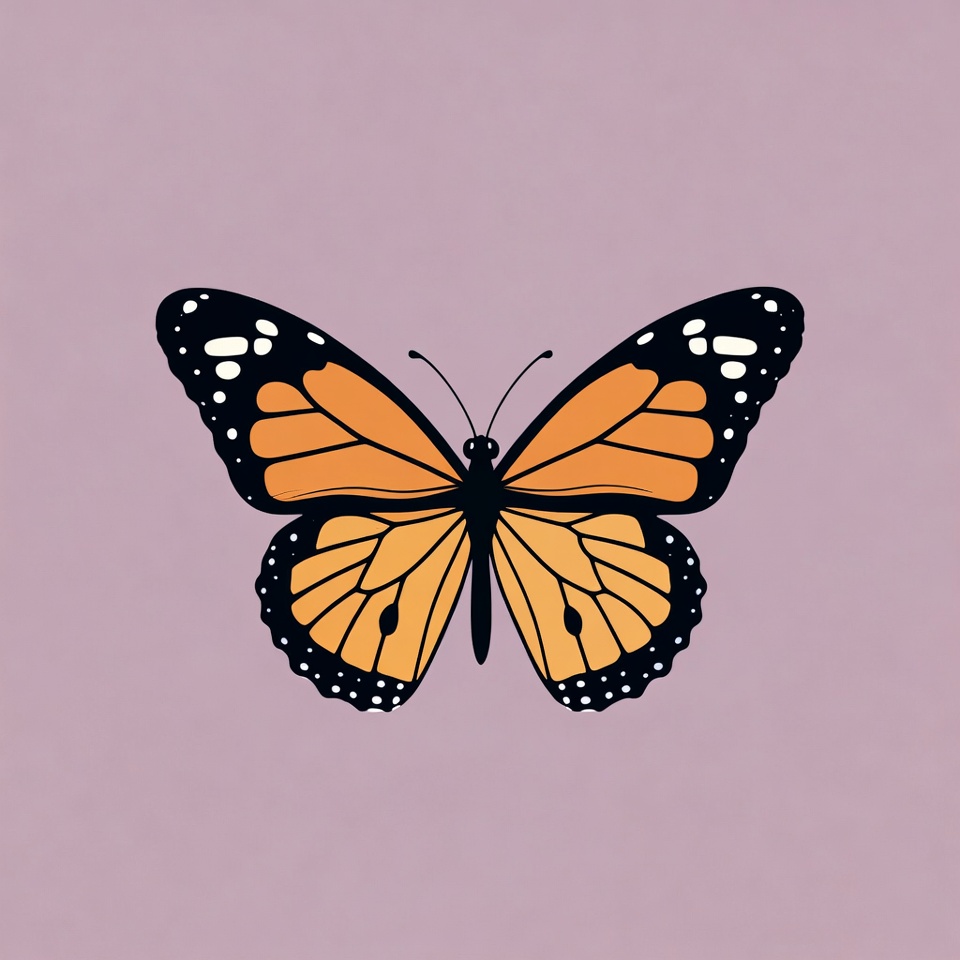A vibrant orange monarch butterfly with black and white wing markings is illustrated against a solid light purple background. The butterfly is centered with wings fully spread open. The design features clean lines and a flat, colorful style.
