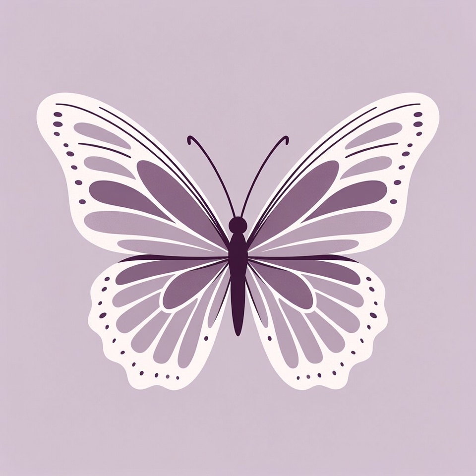 A detailed vector illustration of a butterfly with purple wings featuring white edges and layered shades of lavender. The butterfly is centered on a light purple background with symmetrical wings spread open. Fine line details accentuate the wings' patterns.