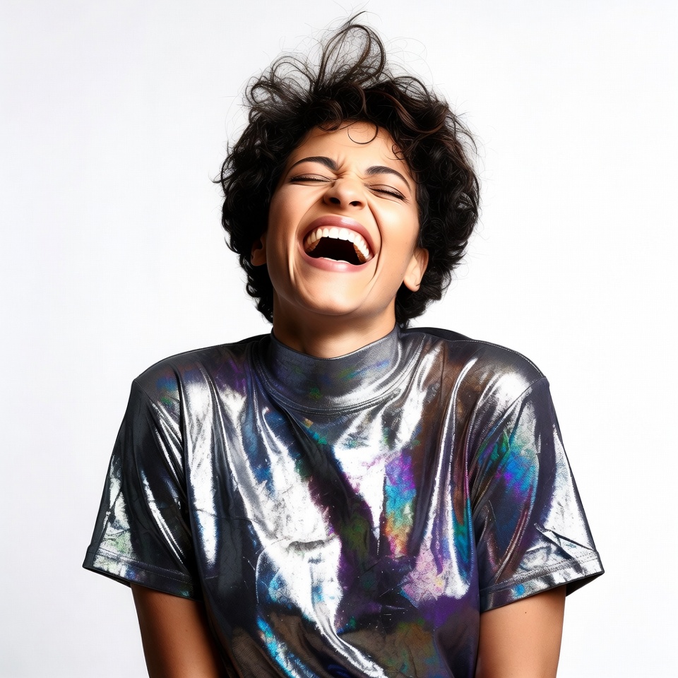 A young African-American woman with curly short hair laughs heartily against a white background. She wears a shiny metallic silver turtleneck top with iridescent hues. Her eyes are squinted in amusement and mouth wide open showing teeth.