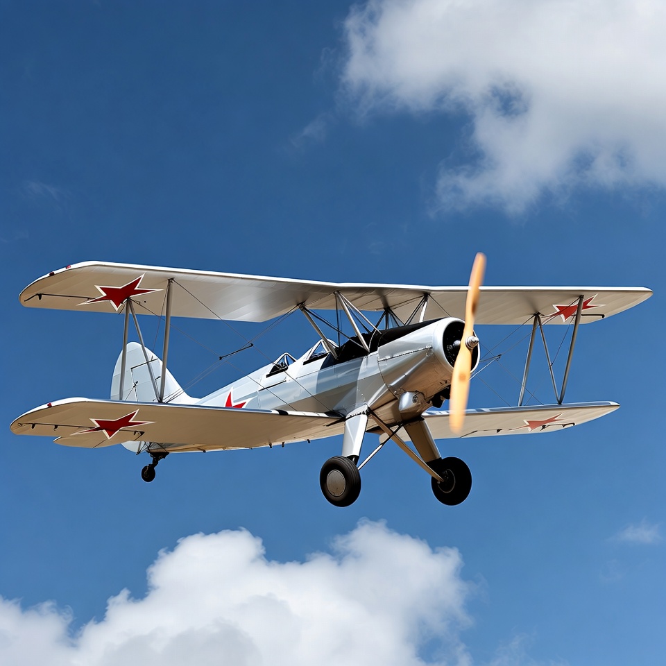 Soviet Biplane Flying in Blue Sky
