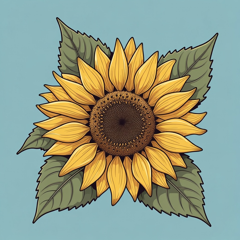 A vibrant sunflower illustration features bright yellow petals surrounding a detailed brown center. Large green leaves extend from the stem, arranged symmetrically around the flower. The artwork is set against a solid light blue background.