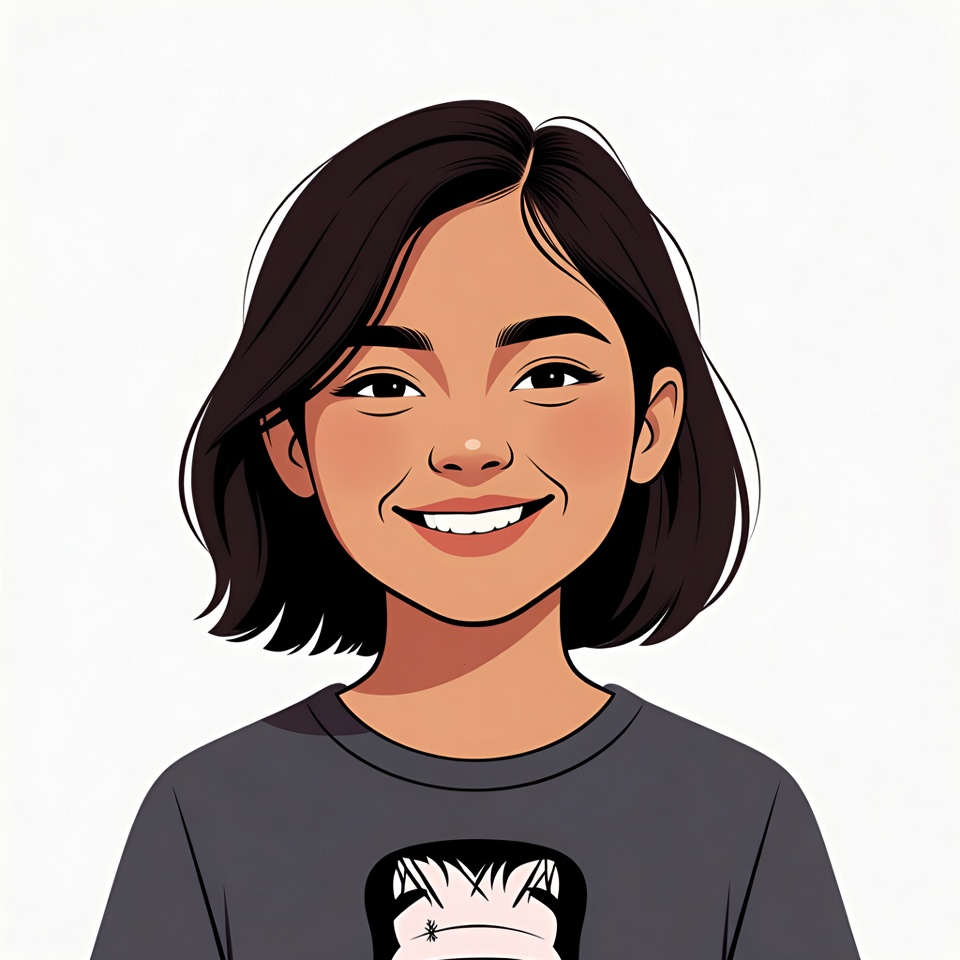A young Asian girl with short dark brown hair smiles warmly at the viewer. She wears a dark gray t-shirt featuring a white cartoon ghost with spiky hair. The illustration is set against a plain white background.