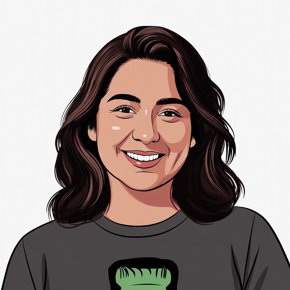 A cartoon illustration of a smiling young woman with long wavy brown hair and brown eyes. She wears a dark gray t-shirt featuring a green logo resembling a shamrock or leaf. The portrait is set against a white background.