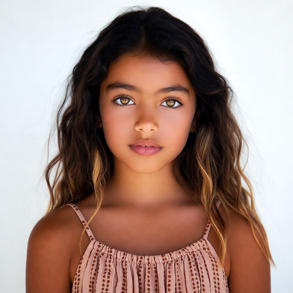 A young girl with long wavy dark brown hair and striking hazel eyes stands against a white background. She wears a sleeveless terracotta-colored dress with a textured pattern. Her skin is smooth and tan, and she has a subtle smile.