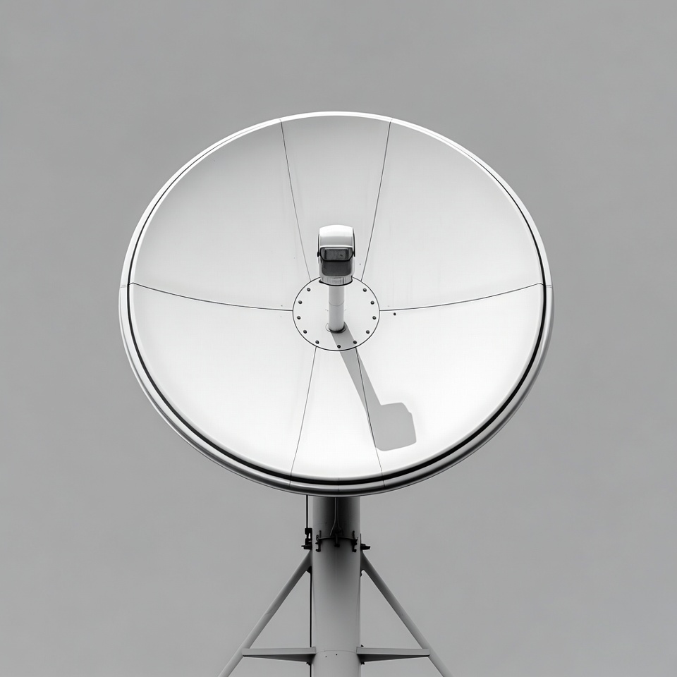 TV receiver, communication equipment, dish antenna, feed horn, gray background, isolated background, outdoor antenna, parabolic dish, satellite antenna, signal receiver, technology, telecom, tripod stand, white dish, satellite dish