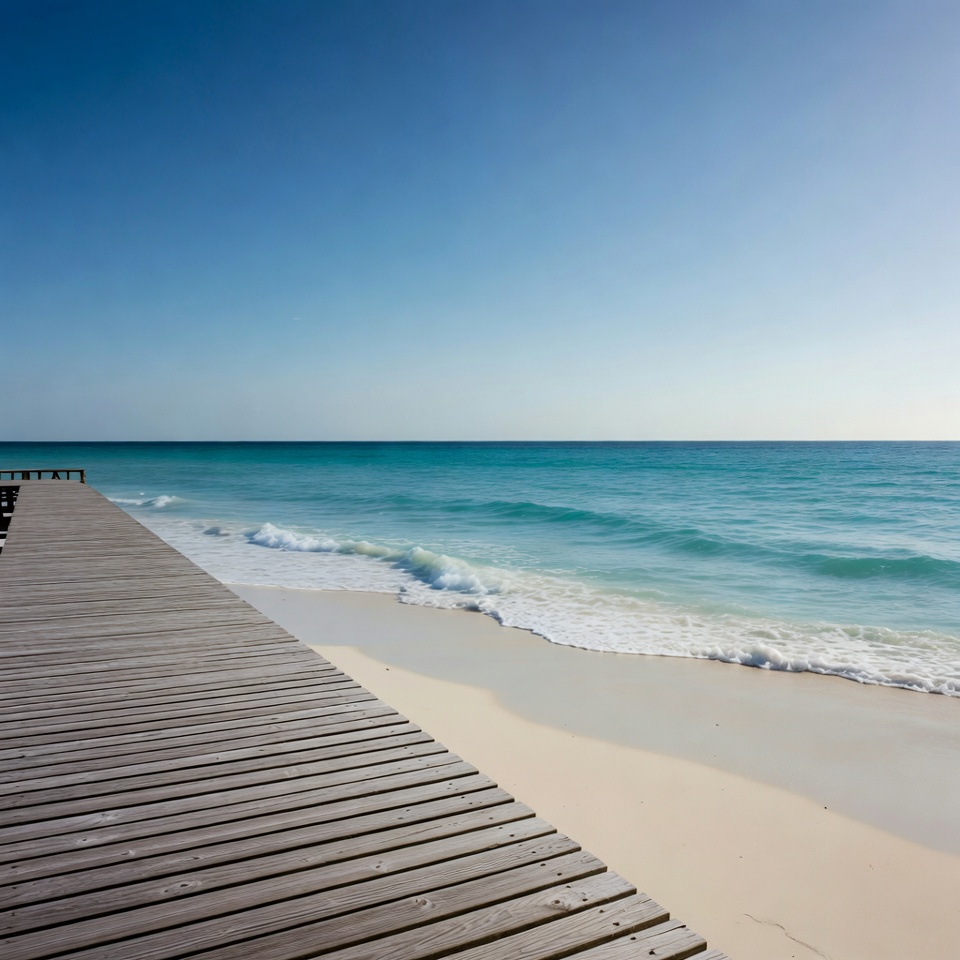 beach, blue sky, clear water, coast, dock, landscape, nature, ocean, paradise, pier, sandy beach, sea, seaside, shoreline, summer, sunny day, travel, tropical, turquoise water, vacation, waterfront, waves, white sand, wooden pier