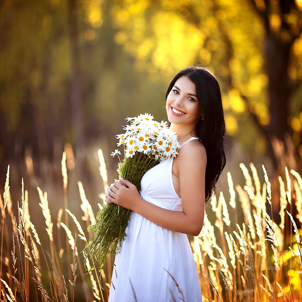 White, autumn, bokeh, bouquet, daisies, dark hair, fall field, female, flowers, forest background, golden grass, grass, happy, long hair, nature, outdoor, portrait, smiling, sunlight, trees, white dress, white flowers, young woman, woman