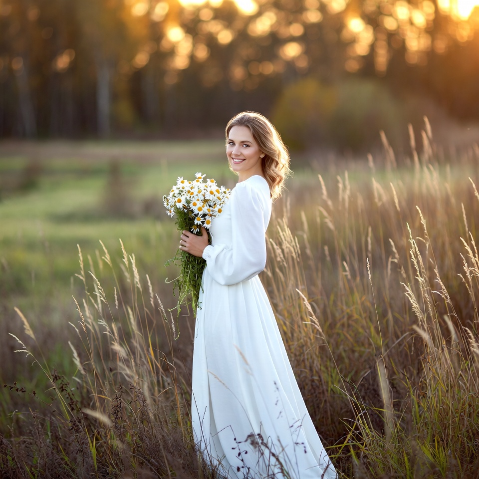 White, autumn, blonde hair, bouquet, daisies, female, field, golden hour, grass, long dress, nature, outdoor, portrait, smiling, sunset, tall grass, white dress, white flowers, woman