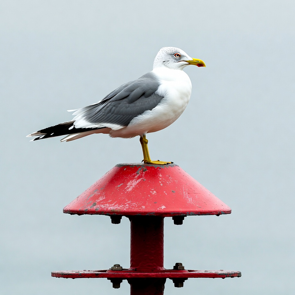 A seagull with gray wings, white body, red legs, and yellow beak stands atop a weathered red conical post. The bird faces slightly to the side with its wings folded. A plain gray sky serves as the background.