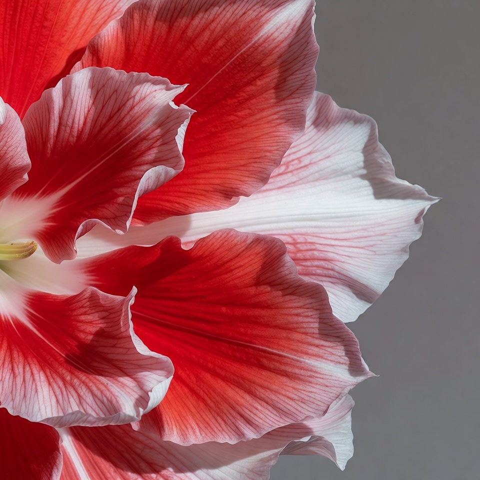 A vibrant red amaryllis flower with white edges on its large petals is captured in closeup. The flower features intricate veining and a central green-yellow stamen. It is isolated against a plain gray background.