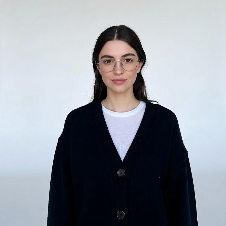 A young woman with long dark hair and glasses stands against a white background. She wears a black cardigan over a white top and has a subtle smile. Her hair is parted in the middle and falls over her shoulders.