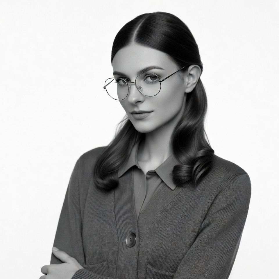 A young woman with long dark wavy hair parted in the middle stands with arms crossed. She wears round metal-framed glasses, a collared sweater, and gazes directly at the viewer. The image is a black and white portrait against a plain white background.