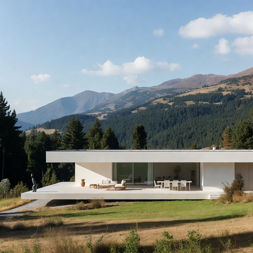 A sleek modern white house with large glass windows sits on a grassy terrace overlooking forested mountains. The minimalist architecture features a cantilevered design, outdoor furniture including lounge chairs and a dining table on the deck. Surrounding pine trees and distant rugged peaks frame the scene under a partly cloudy sky.