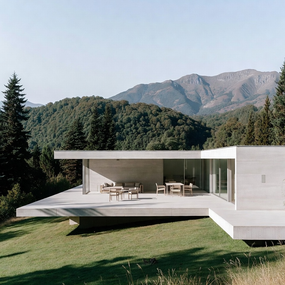 architecture, contemporary architecture, elevated house, forest, glass windows, grass, hillside, landscape, luxury home, minimalist house, mountains, nature background, outdoor furniture, pine trees, scenic view, sunny day, terrace, white house, wooden furniture, modern house