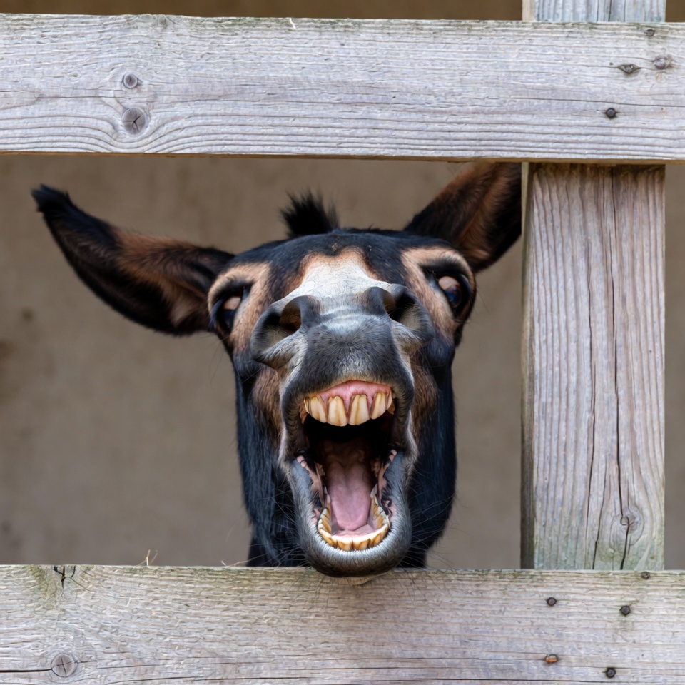 A donkey with dark brown fur and white muzzle pokes its head through a wooden fence slats. Its mouth is wide open in a braying expression, revealing large teeth. The background is a light-colored barn interior.