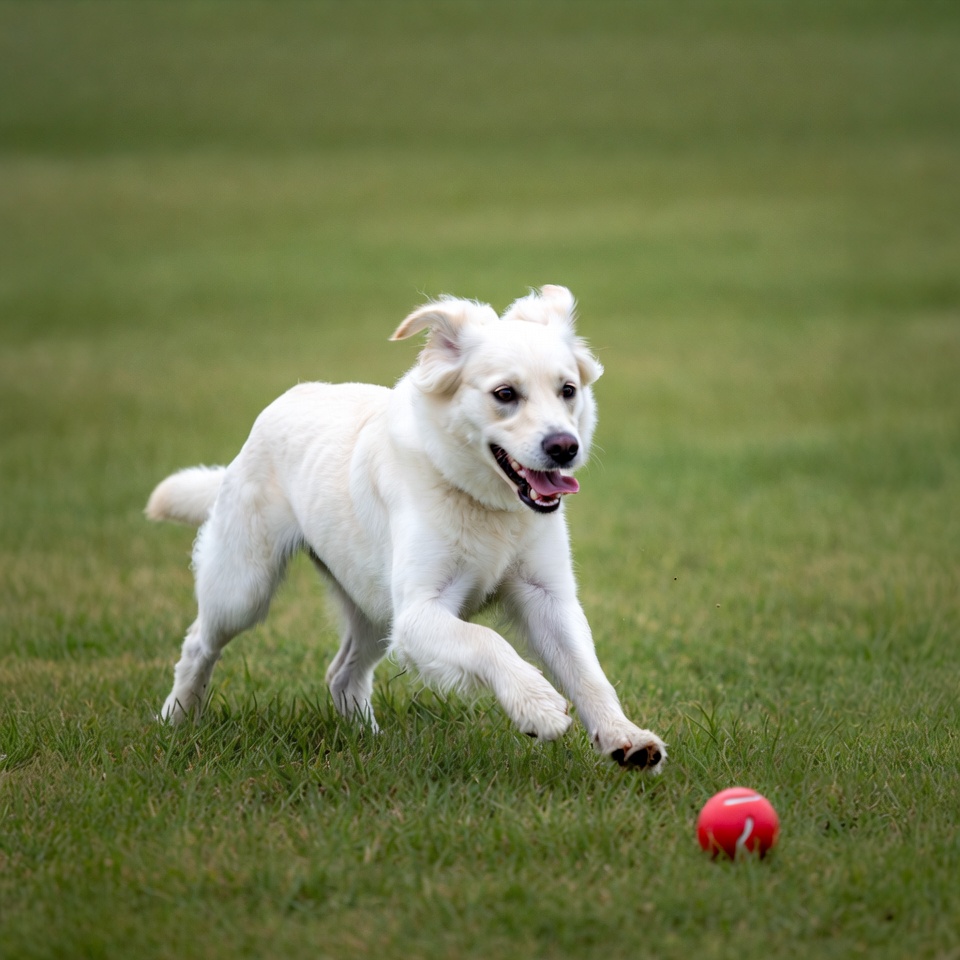 canine, chasing ball, field, floppy ears, fluffy dog, grass field, green grass, happy dog, outdoor, pet dog, playful dog, puppy, red ball, running dog, tennis ball, white dog, dog