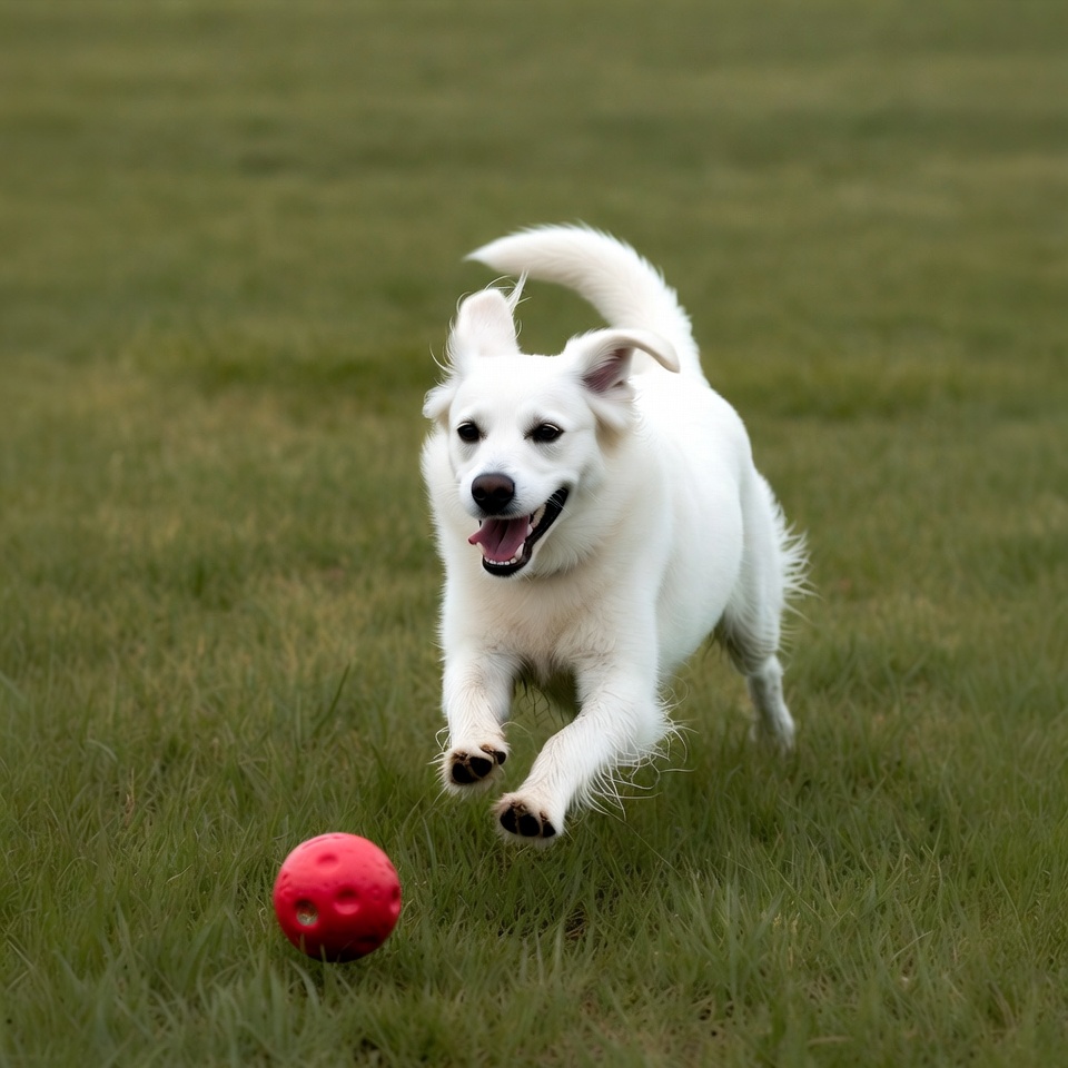 animal, canine, chasing ball, dog, dog playing, fetch, fluffy dog, grass field, green grass, outdoor, pet dog, playful dog, red ball, running dog, white dog