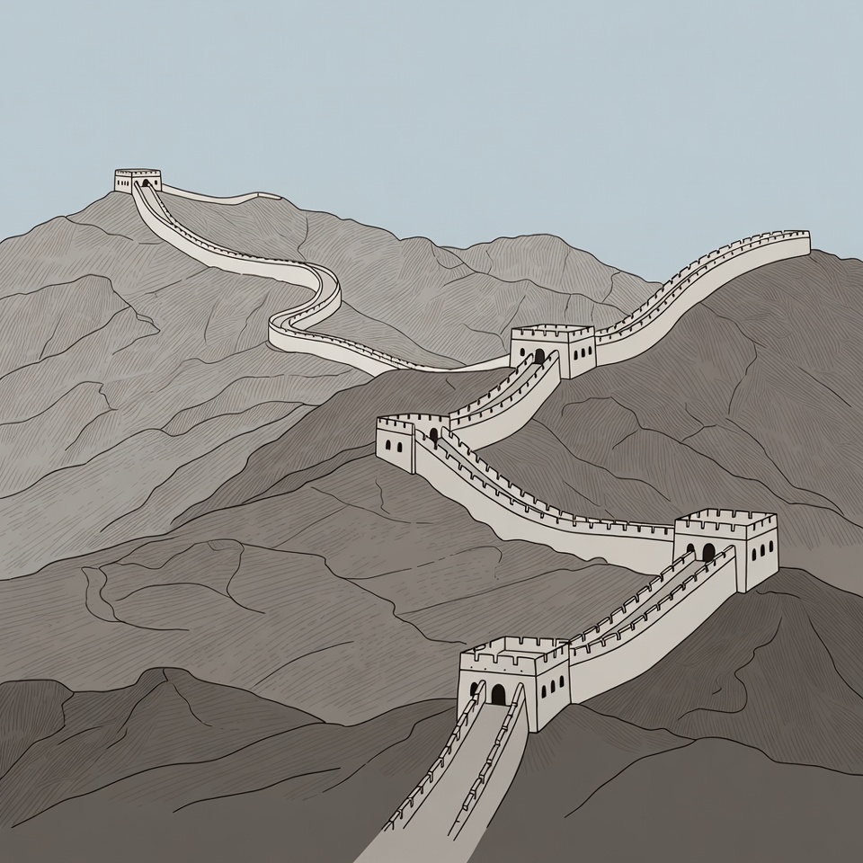 A line drawing illustration depicts the Great Wall of China winding across steep, rugged mountains. The ancient stone wall features multiple watchtowers and battlements. The scene is rendered in grayscale tones against a light blue sky on an isolated background.