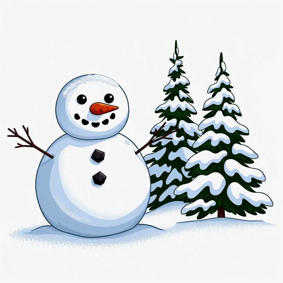 A cheerful clipart snowman with black eyes, carrot nose, and coal buttons stands on snowy ground. It has twig arms and is positioned in front of two snow-covered pine trees. The illustration features a simple white background.