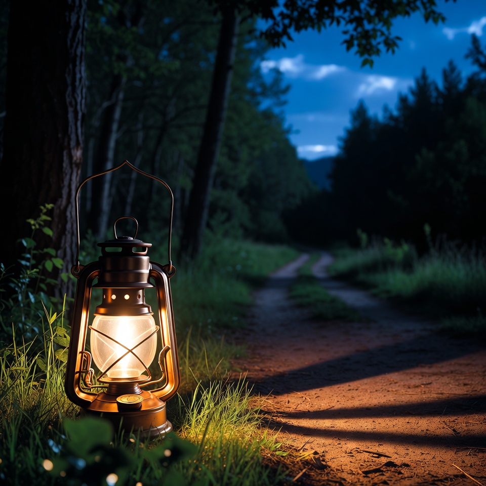 dark forest, dirt path, evening, foliage, forest, glowing light, grass, moonlight, mountains, nature, night, outdoor, path, pine trees, rustic lantern, serene forest, shadows, stars, trail, trees, twilight sky, vintage lantern, woodland path, woods, lantern