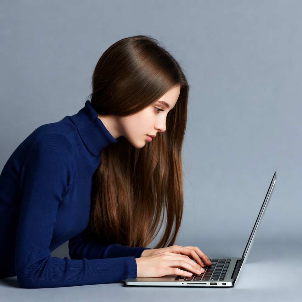 A young woman with long brown hair wears a blue turtleneck sweater while leaning over a silver laptop on a gray background. She types intently on the keyboard with both hands, her face turned toward the screen. Her hair cascades over her shoulder as she focuses on her work.