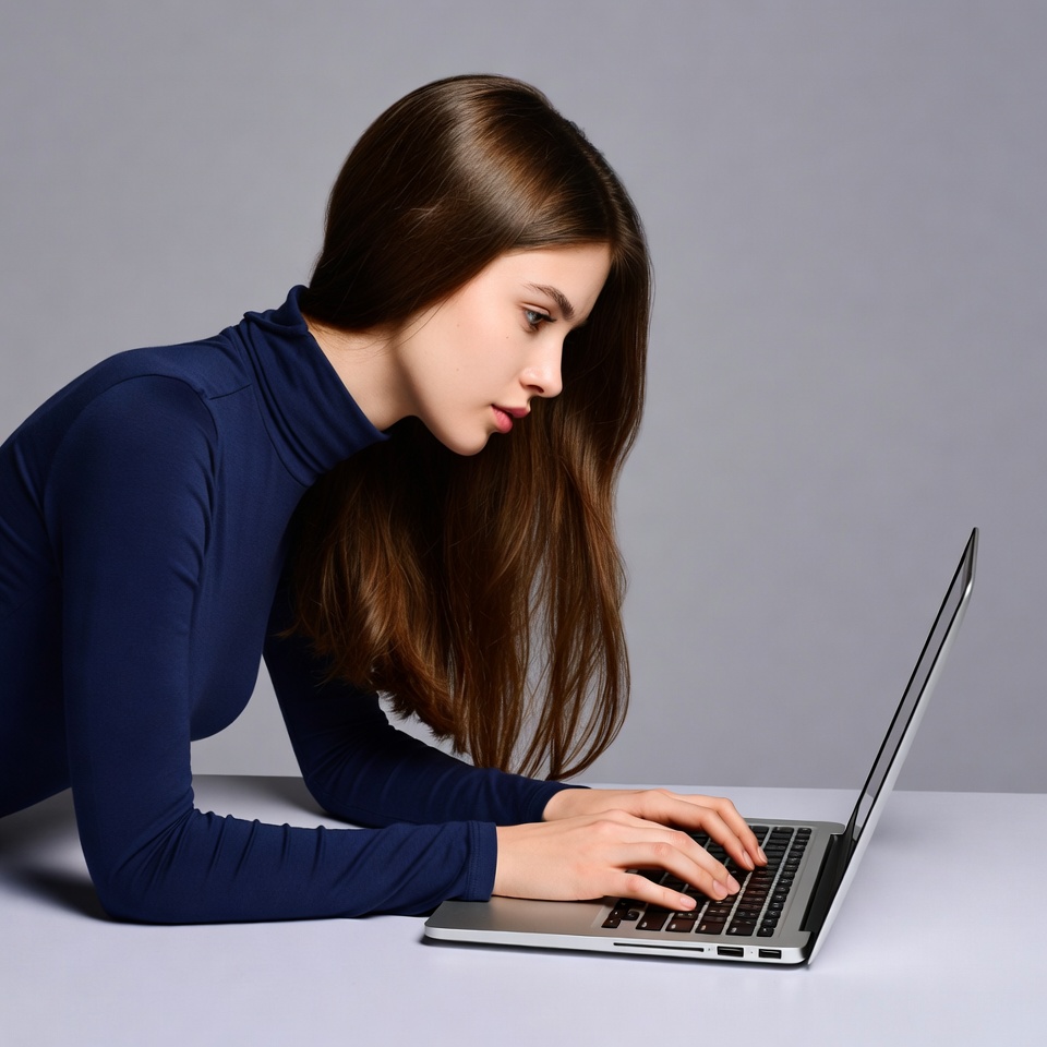 A young woman with long brown hair leans forward over a table, typing on a silver laptop. She wears a form-fitting navy blue turtleneck sweater and gazes intently at the screen. The background is a plain gray studio setting.
