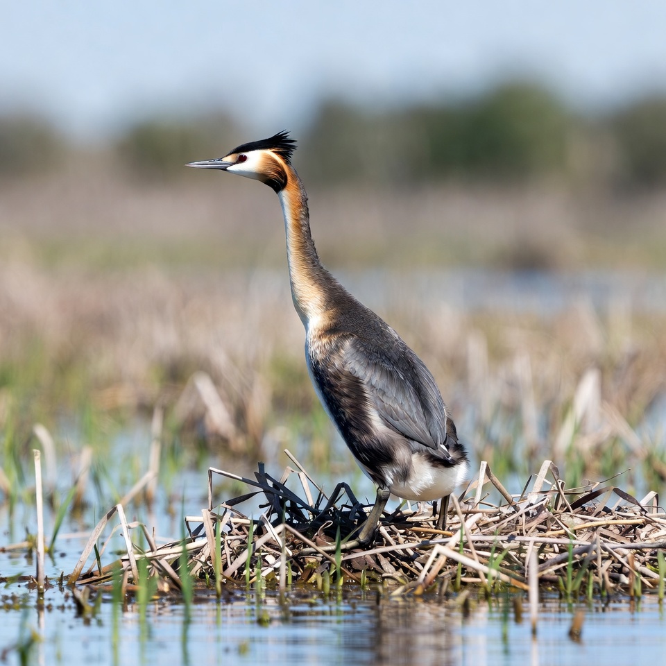 avian, beak, bird, birdwatching, black crest, crest, feathers, grebe, long neck, marsh, nature, neck, nest, reeds, shallow water, standing, water, water bird, waterfowl, wetland, white tips, wildlife, great crested grebe