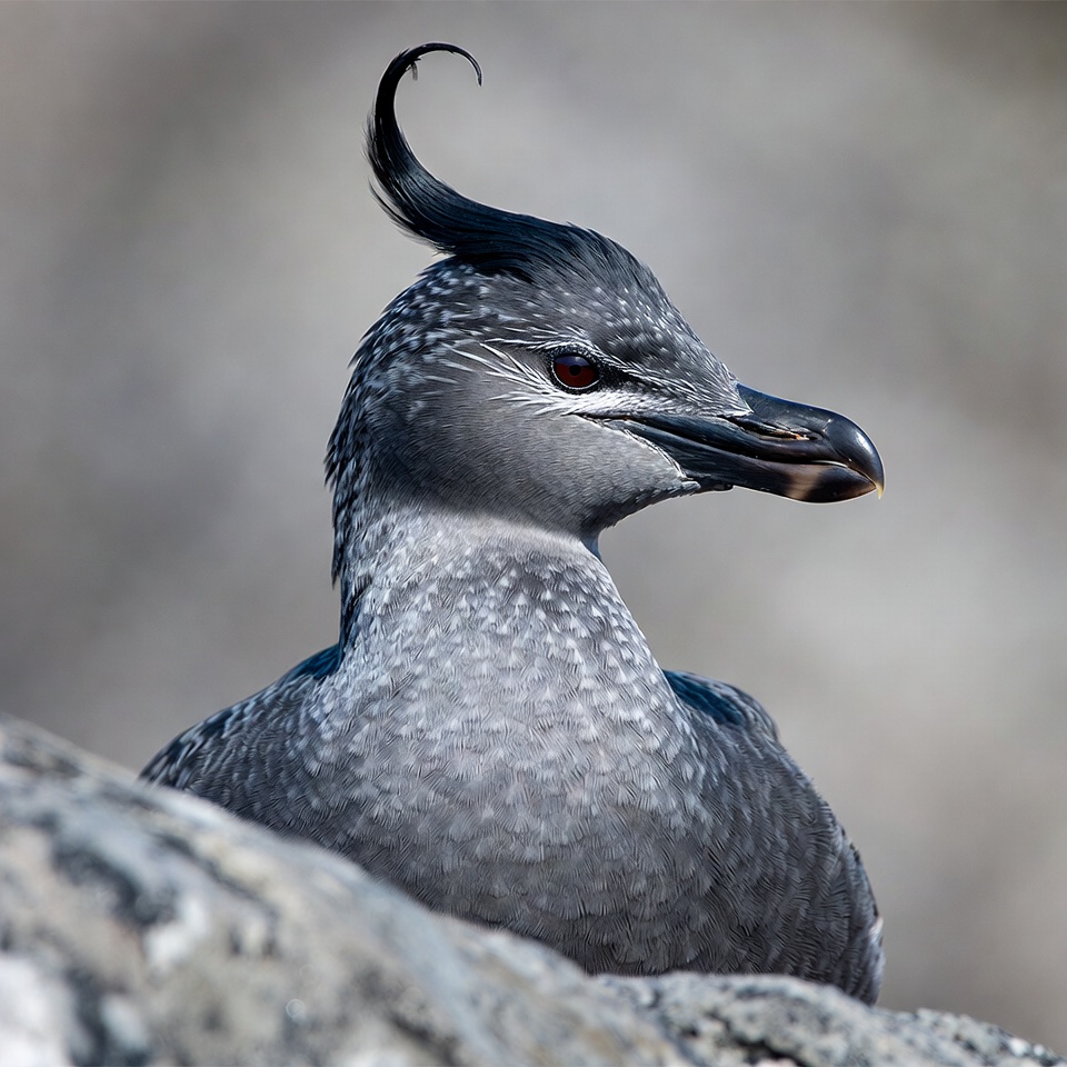 A crested penguin with a prominent black curly crest stands on a gray rock. Its feathers are dark gray with white spots, and it has a sharp red eye and black beak. The bird faces slightly to the side against a blurred gray background.