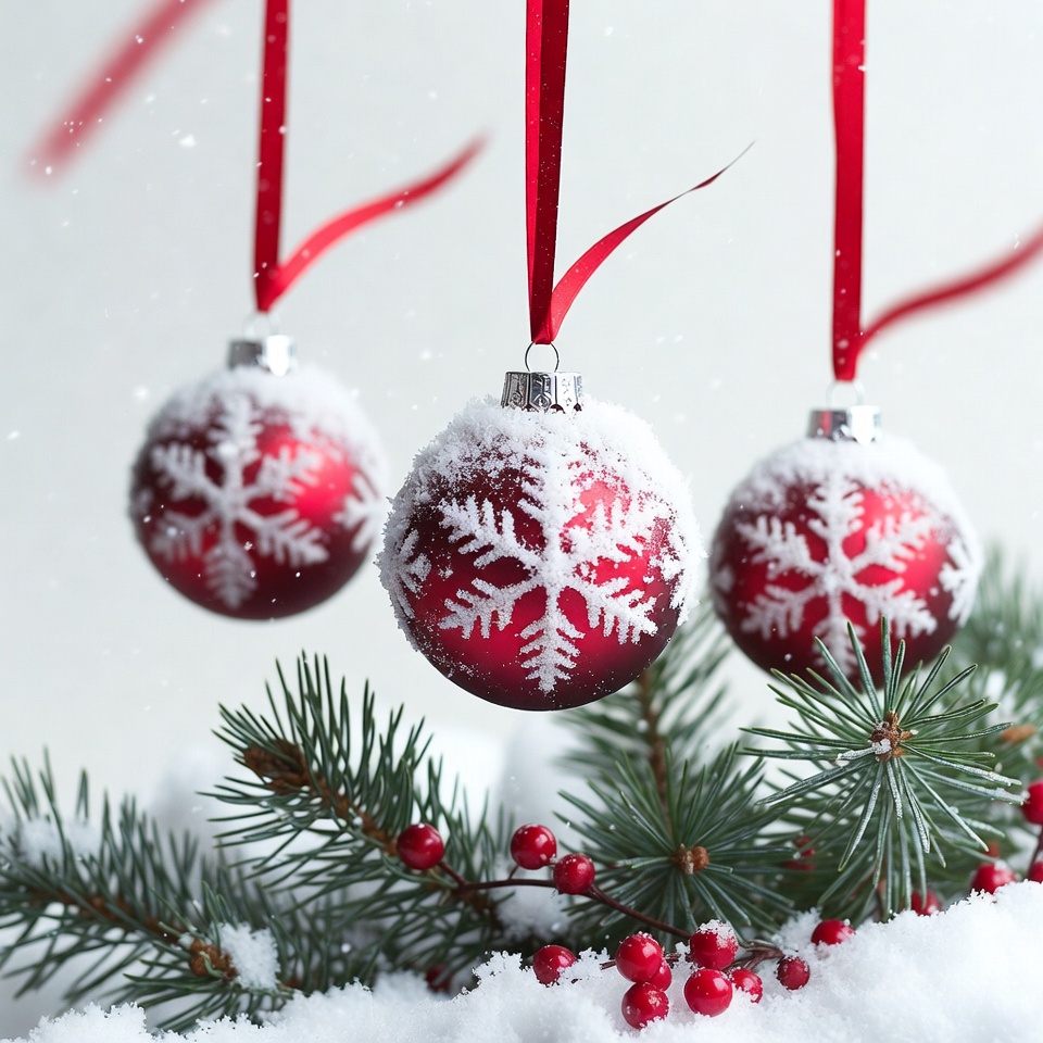 Three red Christmas baubles with white snowflake designs hang from red ribbons against a white background. They are adorned with faux snow and positioned above green pine branches and red berries covered in snow. The ornaments have a shiny metallic finish.