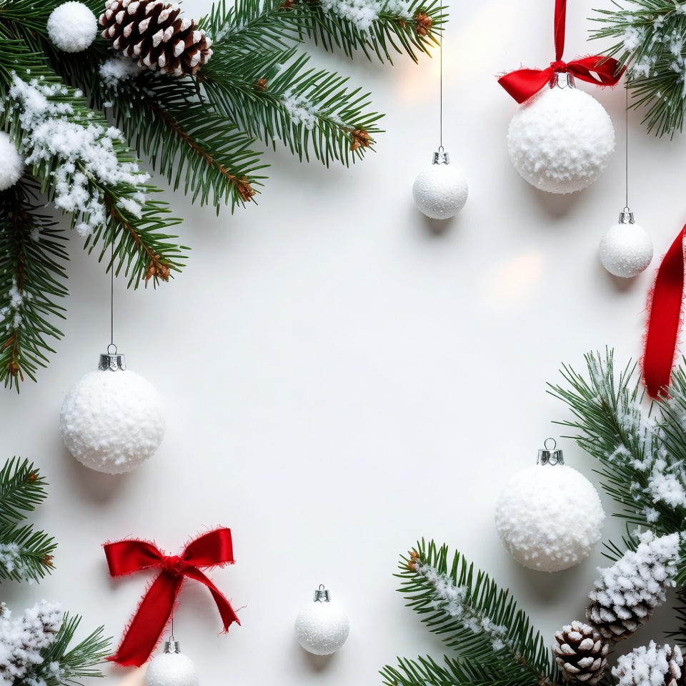 Festive Christmas arrangement features lush green pine branches with snow and pine cones framing a white background. White fluffy and shiny ornaments hang from red ribbons and strings. Red bows add accents throughout the isolated border design.