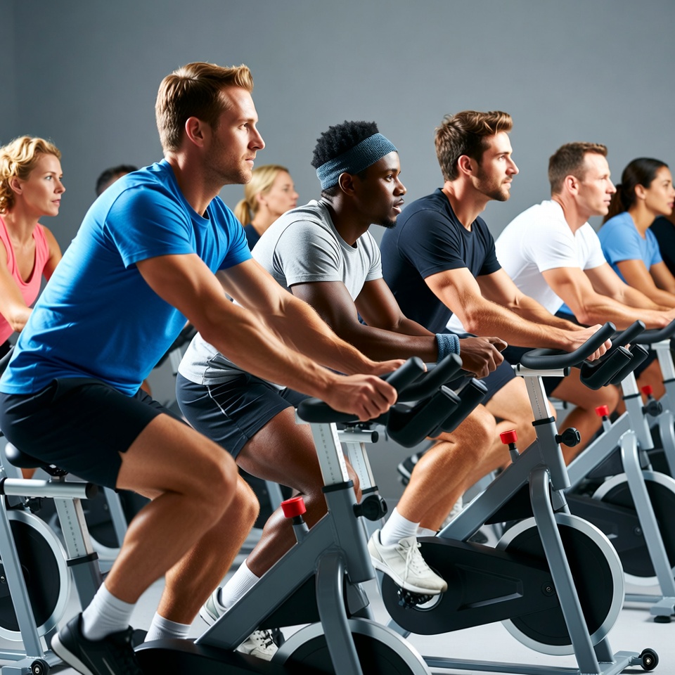 Diverse group exercising on spin bikes